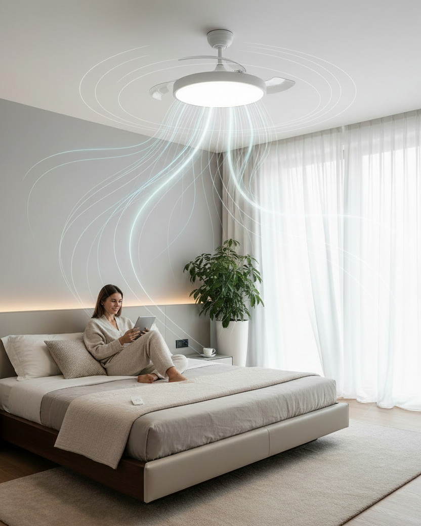 Brisa rinfresca l’ambiente in modo efficace e discreto, con un funzionamento fluido e silenzioso. Grazie alle 6 velocità selezionabili puoi regolare il flusso d’aria in base alle tue esigenze, ottenendo sempre il giusto comfort in soggiorno, in camera o negli spazi di tutti i giorni.